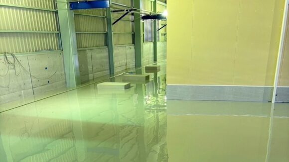 エポキシ系は耐久性・耐薬品性に優れており、製造業や食品工場などで多く採用されています。アクリル・エポキシに比べ塗膜が非常に強固です。ツヤがあり、美観性にも優れるため、明るく清潔な印象を与える効果があります。 ただし、紫外線に弱いため、屋外ではなく屋内での使用に向いています。